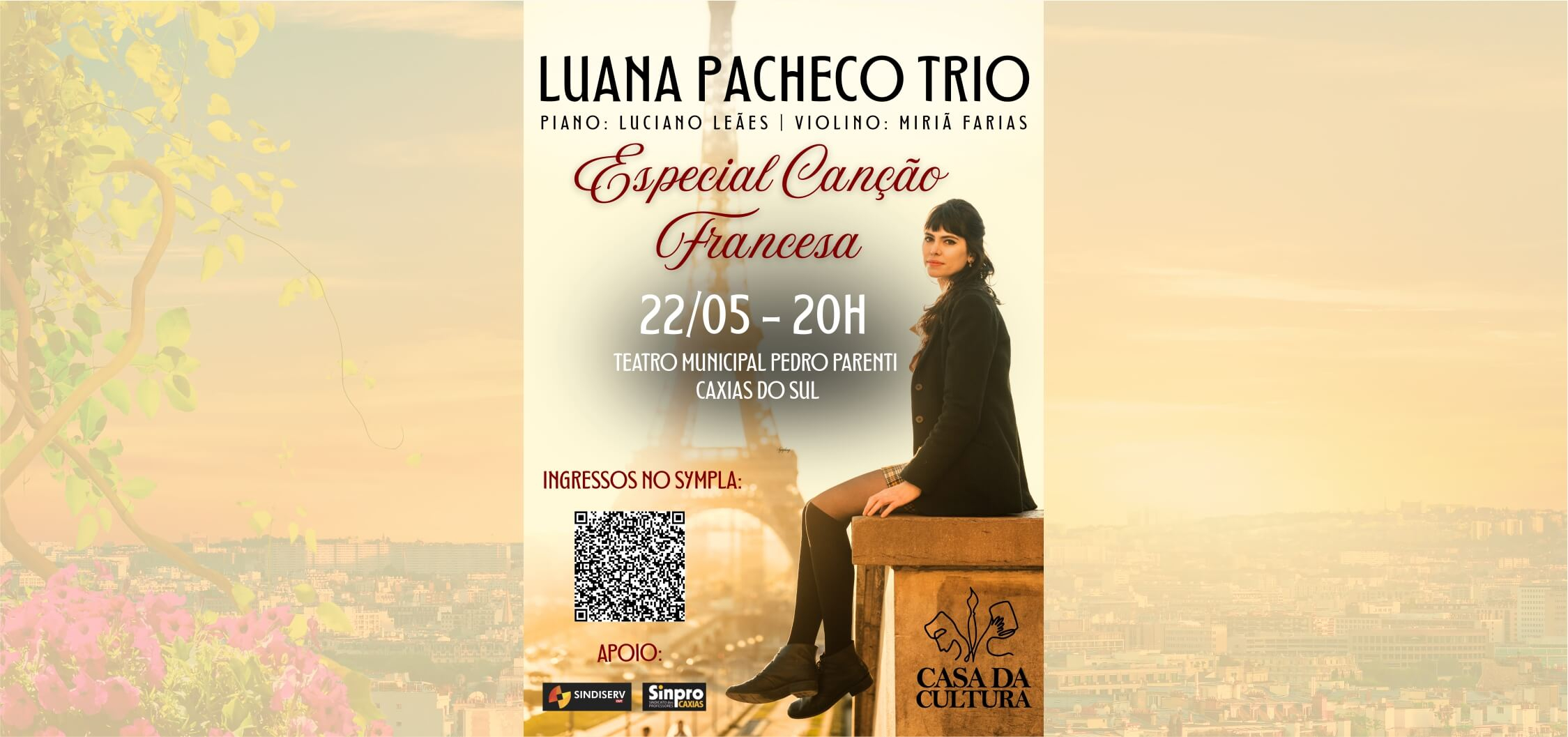 O grupo LUANA PACHECO TRIO promove o espetáculo ESPECIAL CANÇÃO FRANCESA no Teatro Municipal Pedro Parenti, em Caxias do Sul, na quinta-feira, dia 22 de maio, às 20h.