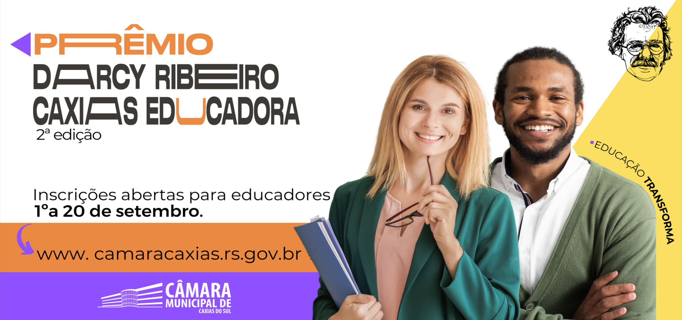 A Câmara Municipal, neste ano de 2025, realiza, pela segunda vez, o Prêmio Darcy Ribeiro - Caxias Educadora. Estabelecida pelo Decreto Legislativo 443/A, de 24 de junho de 2022, a iniciativa busca reconhecer profissionais da educação que desenvolvem projetos nas redes pública e privada de ensino e educadores não formais. Para concorrer, os profissionais devem inscrever seus projetos até o dia 23 de setembro, por meio deste formulário. Também precisam seguir o que estabelece este regulamento da 2ª edição.